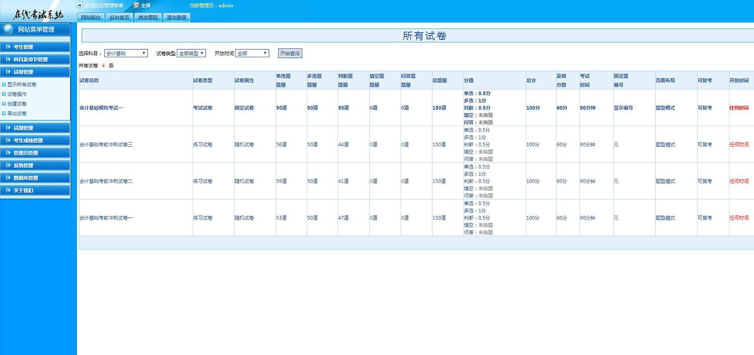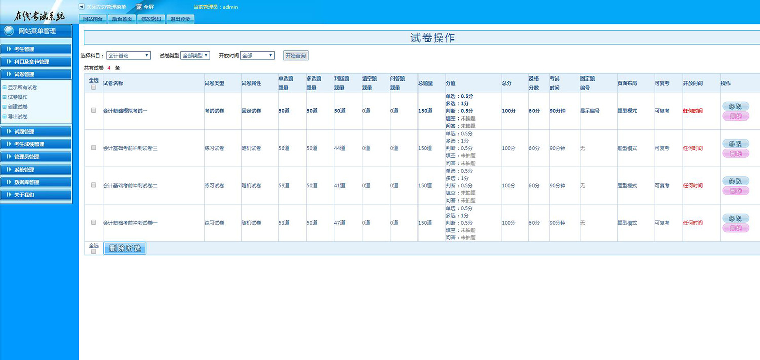 隨機(jī)組卷:此組卷方式在組卷時需要指定單選、多選及判斷時需要抽取的題數(shù),在考試時每個學(xué)生的試題內(nèi)容及順序不相同,但總題數(shù)是相同的,且都屬于同一科目。